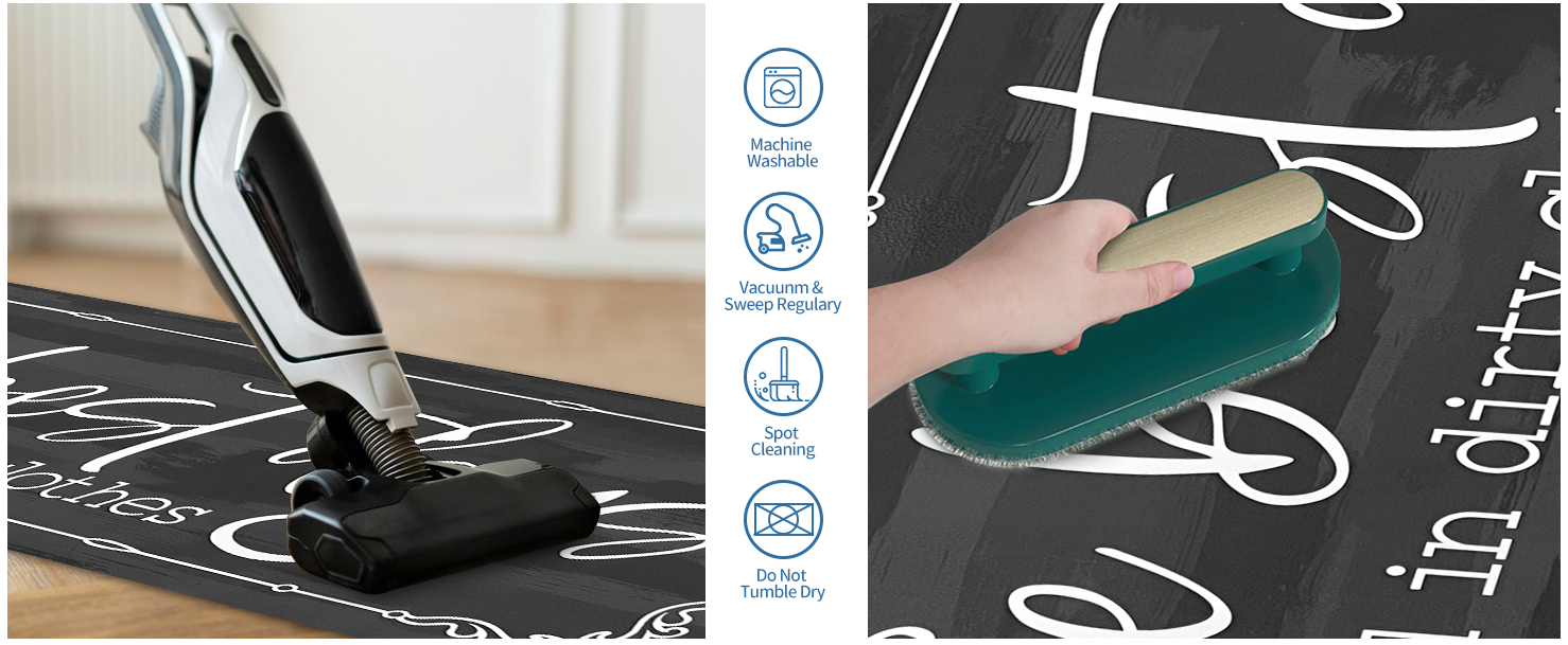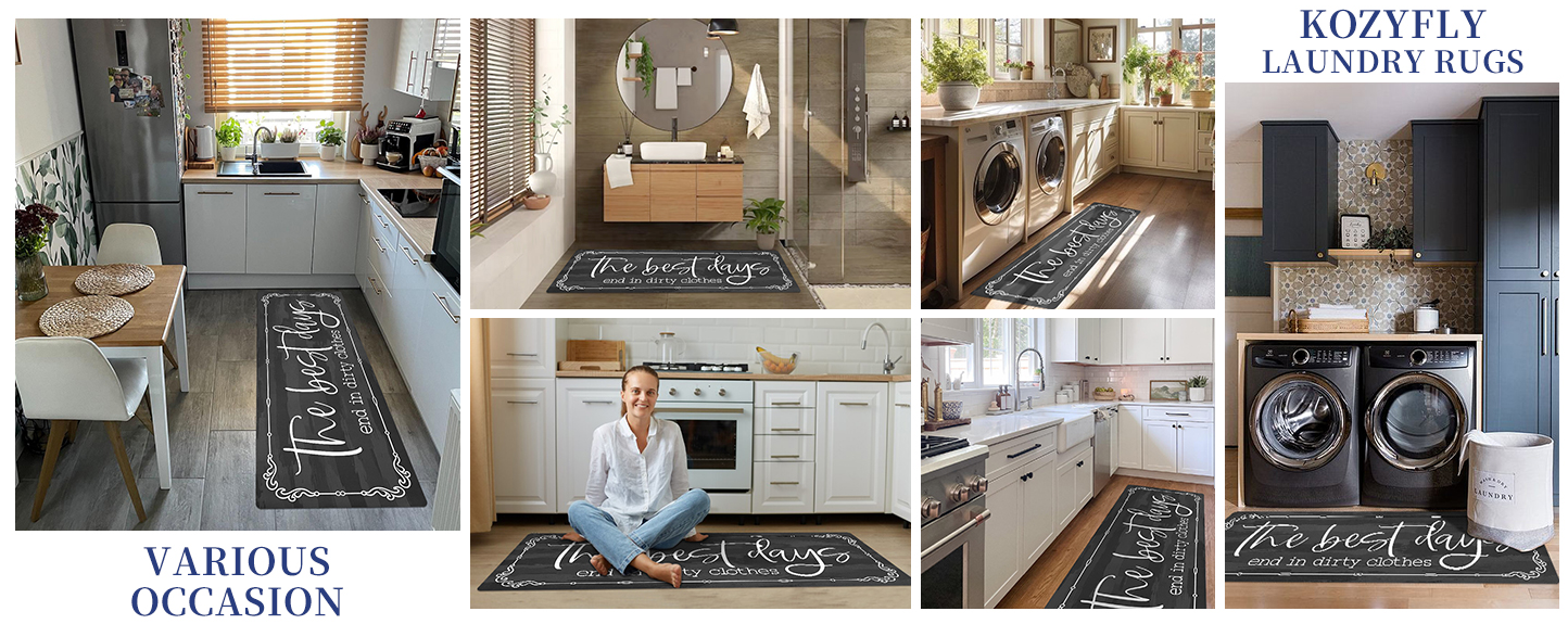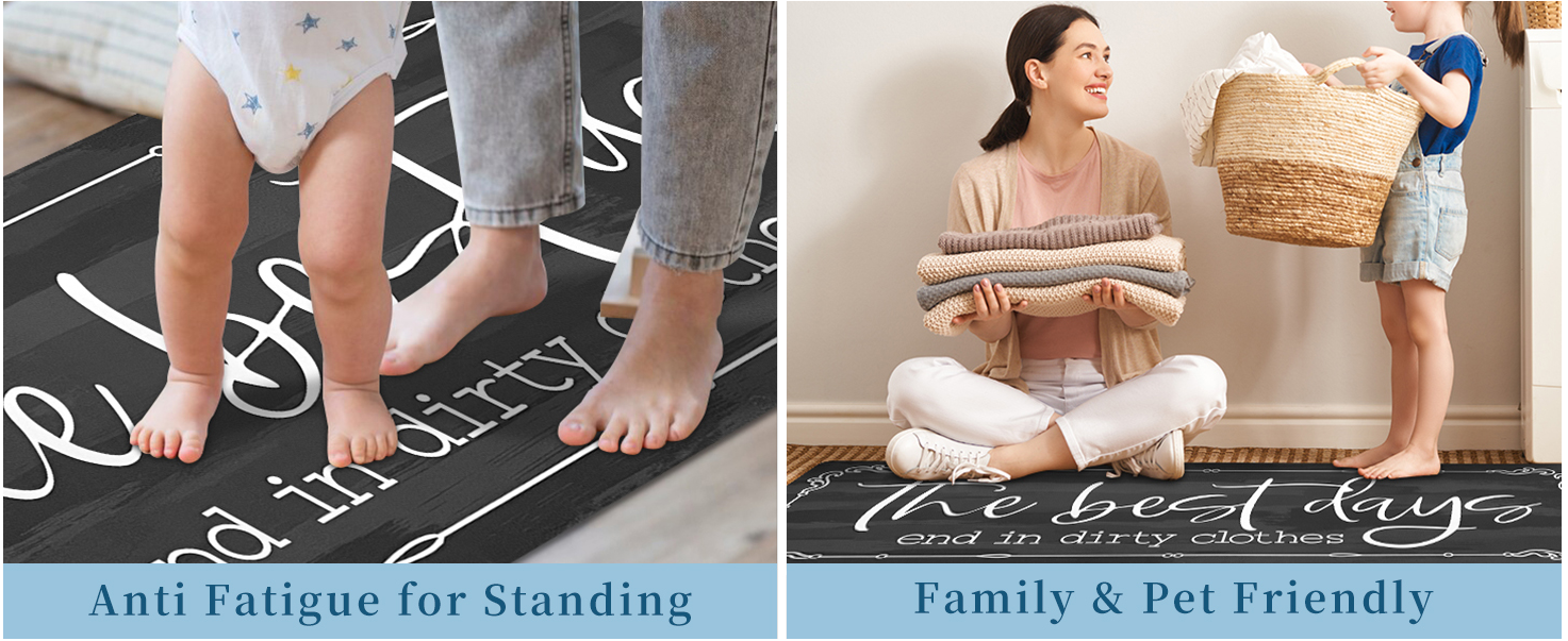 Anti-Fatigue Runner Rug: The laundry room mats feature with flocking finish & dense rubber foam backing. The soft flocking finish makes you feel comfortable under foot, and the rubber foam has a nice cushion, comfortable to stand on. It is not just a laundry rug runner, but an anti-fatigue kitchen rug.
