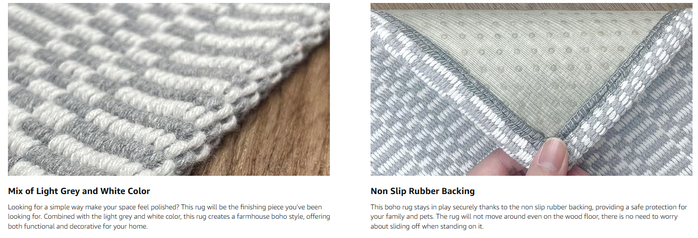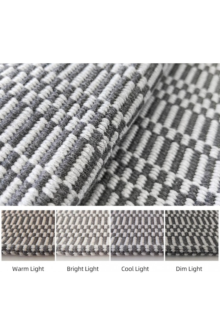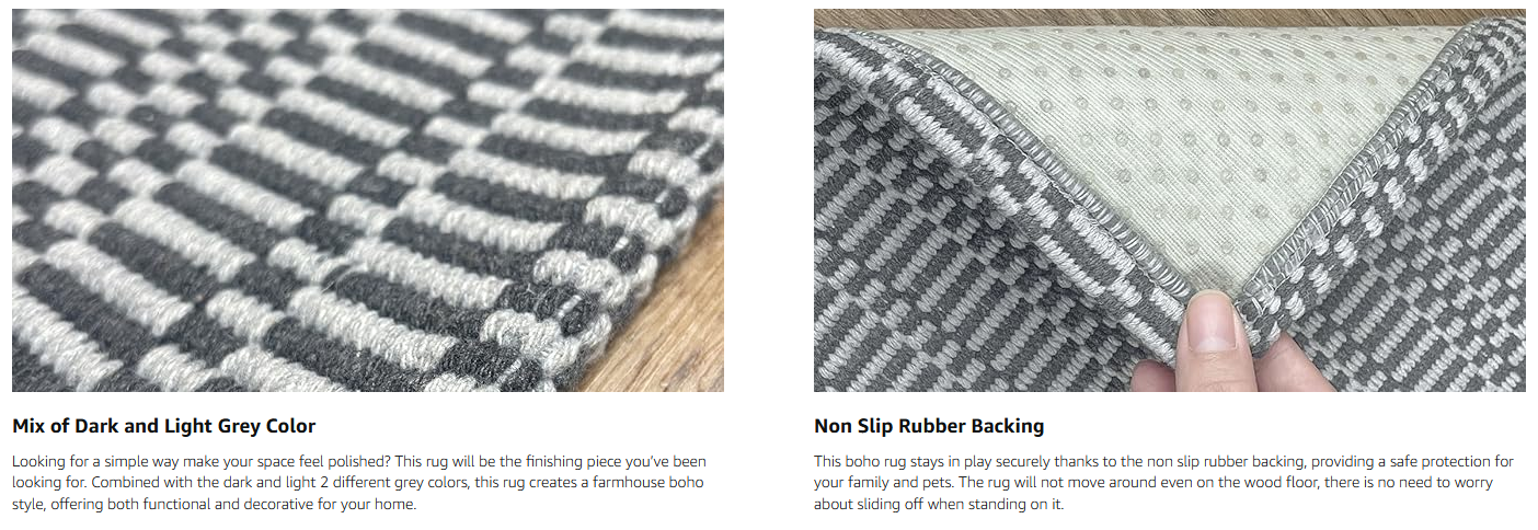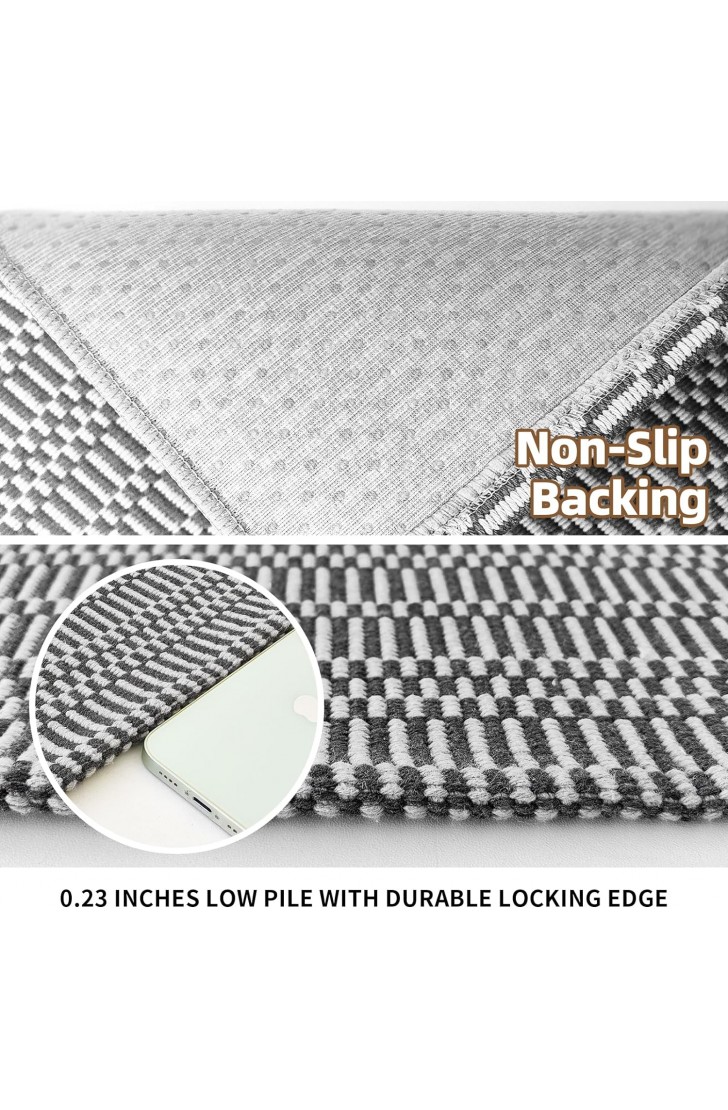 【Versatile Boho Rugs】 This Boho washable area rug has a beautiful bohon pattern, not printed. It is not a solid dark gray color but has a chic geometric pattern with a classic braided texture that'll bring a touch of farmhouse decor to your home. Get ready to elevate your hallway, Kitchen, bathroom, front door, laundry room, bedroom and living room with this boho beauty!